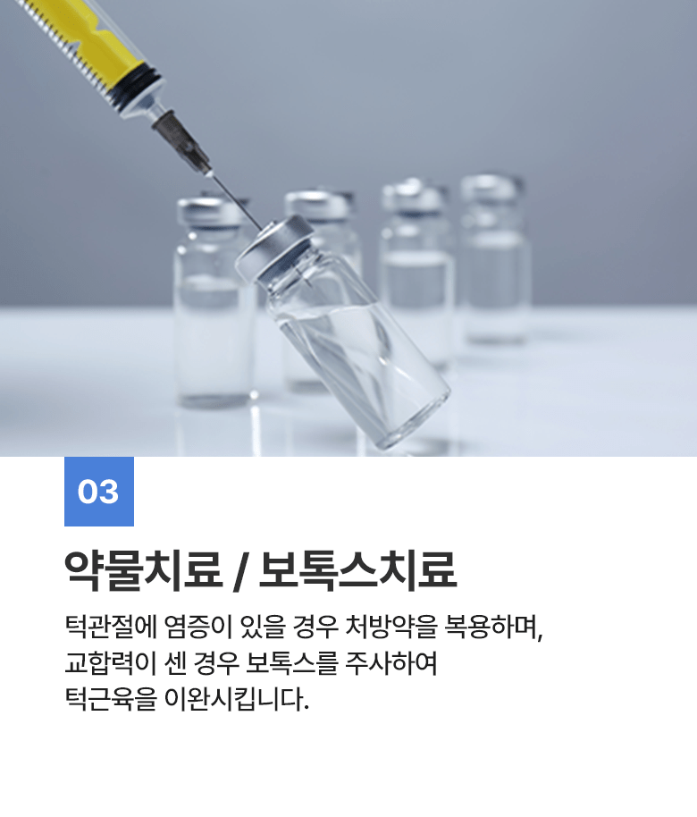 교합력이 센 경우 보톡스를 주사하여 턱근육을 이완시킵니다.