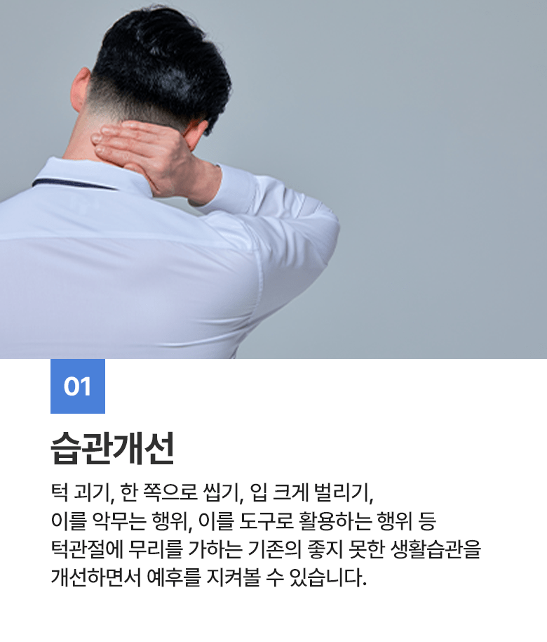 턱관절 질환이 발생한 주요원인을 파악해 근본적인 문제를 해결 하는 방식으로 치료가 진행됩니다.