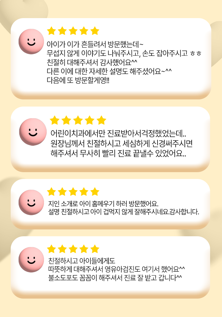 어린이의 눈높이와 페이스에 맞추어 진료합니다.