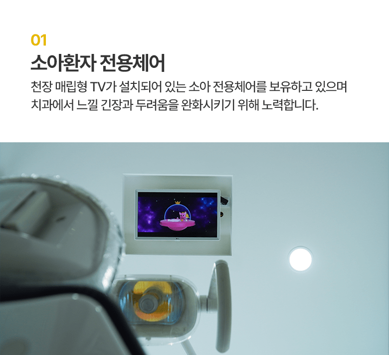 천장 매립형 TV가 설치되어 있는 소아 전용 체어를 보유하고 있으며