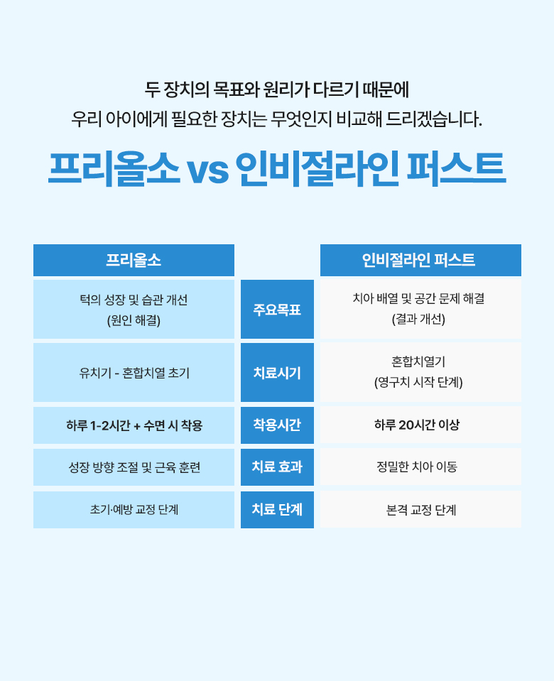두 장치의 목표와 원리가 다르기 때문에 우리 아이에게 필요한 장치는 무엇인지 비교해 드리겠습니다.