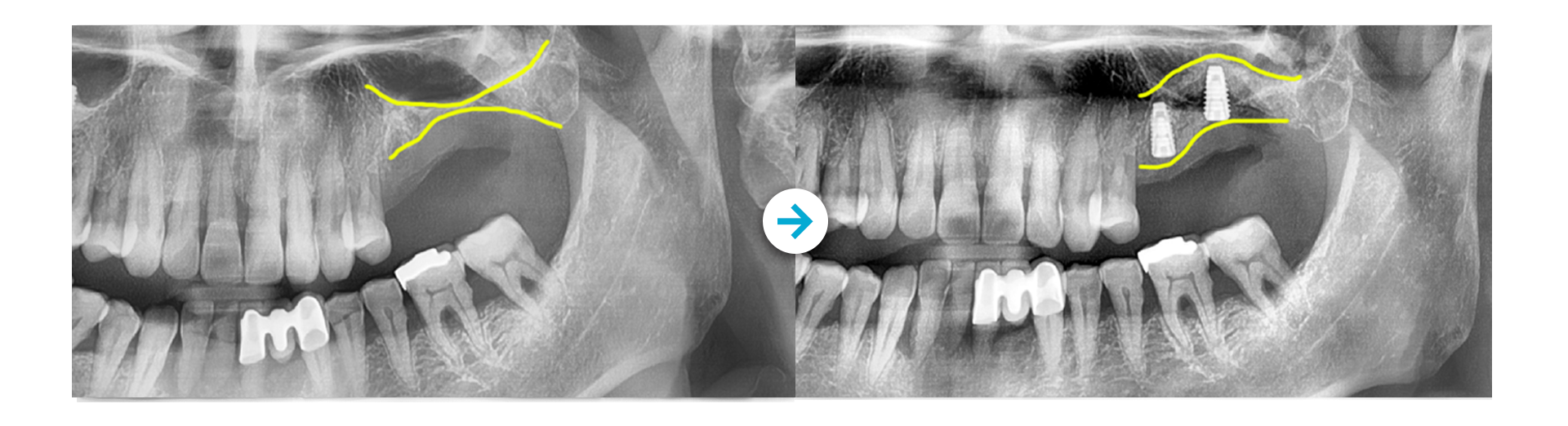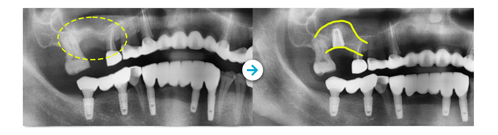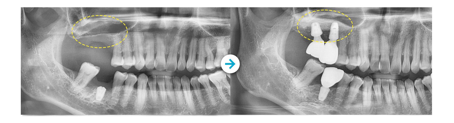 안정적으로 인공치근을 고정하기 위해 부족한 잇몸뼈의 양을 보강한 후 진행하는 임플란트입니다.