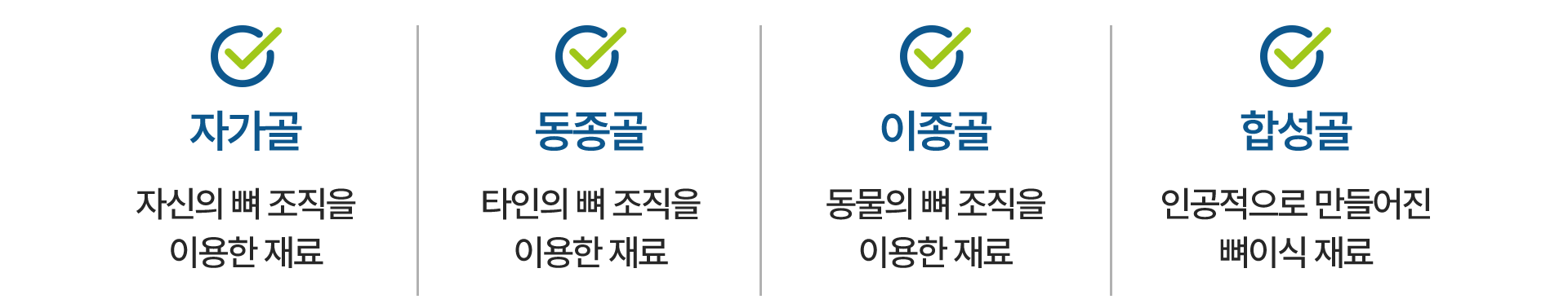 * 이식재마다 장단점이 있으므로 구강상태와 필요한 뼈 이식양에 따라 적합한 재료를 선택하여 사용하심이 좋습니다.