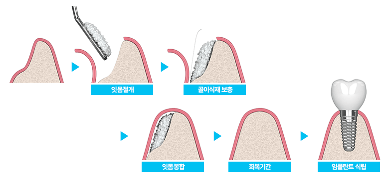 뼈 이식재를 보충하여 골 형성을 유도하고 임플란트가 안정적으로 식립될 수 있는 상태로 만들어 주는 시술입니다.