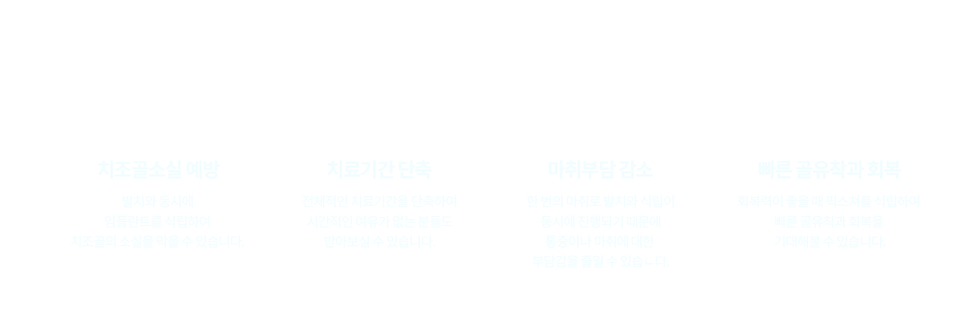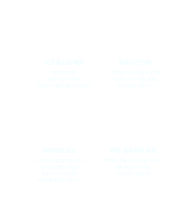 발치즉시 임플란트는 식립과 임시 보철물 장착이 한 번에 이루어지기 때문에 치료 기간과 내원 횟수를 단축해 볼 수 있습니다.